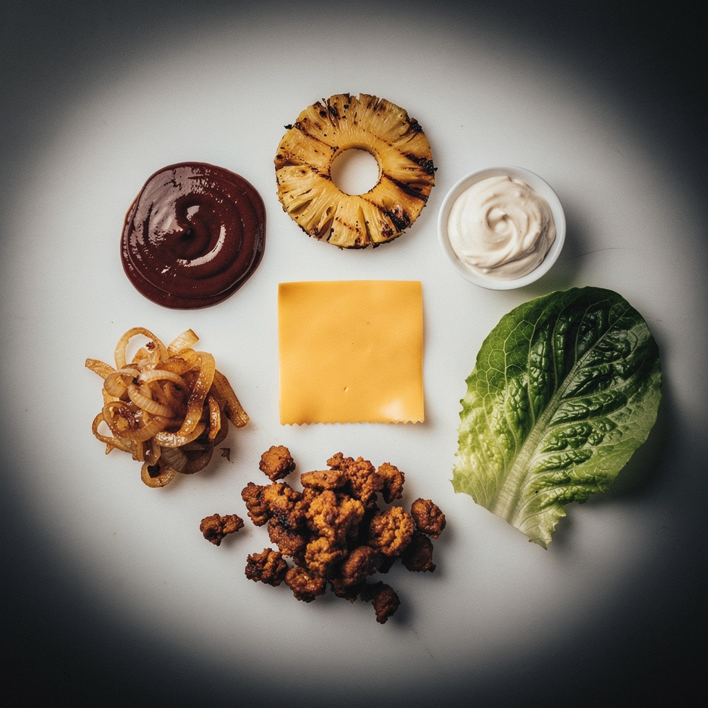 Sauce, Grilled Pineapple, Cheese, Choose Filling, Caramelised Onion, Lettuce, Mayo.